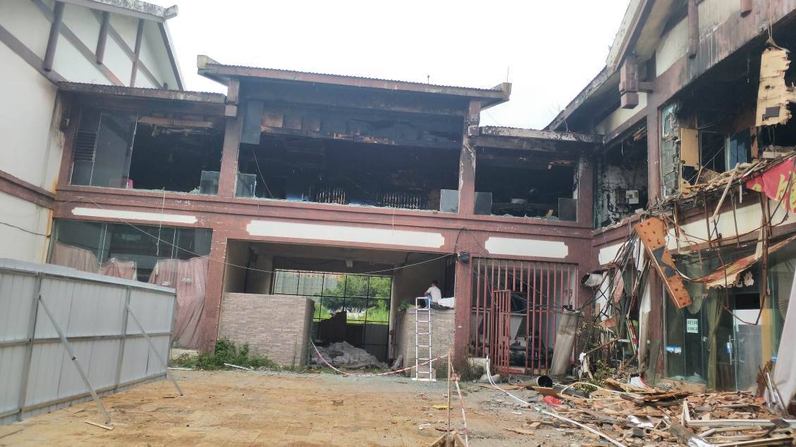 2、火灾情况调查 根据我司检测人员现场向业主了解,火灾的基本情况如下: 2020 年 08 月 15 日下午明浩·天元 A 栋房屋发生火灾,起火位置为该房屋 1 层 3-7/J-K 轴、2-5/G-J 轴、6-7/H-J 轴、2 层 1-7/A-L 轴、7-9/A-D 轴,2 层夹层 1-5/C-J 轴过火时长约为 2 小时,火灾造成房屋内部各区域结构不同程度受损。 根据现场调查情况,1 层 3-7/J-K 轴、2-5/G-J 轴、6-7/H-J 轴、2 层 1-7/A-L 轴、 7-9/A-D 轴,2 层夹层 1-5/C-J 轴区域混凝土梁、柱、板普遍存在表面熏黑,混凝 土保护层局部剥落现象,基本评定该区域火场温度为 200~300℃。